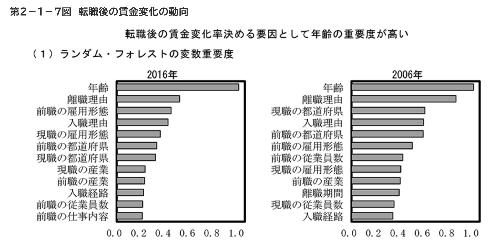 まず、転職前後の賃金変化と関係の深い変数を調べるため、機械学習の手法を用いて、転職後に賃金が変化する人の特徴について整理する。ここでは機械学習の分野でよく使われている「ランダム・フォレスト」という手法を用いた。同手法は、説明変数の数が多くても対応でき、それぞれの説明変数の「重要度」を算出できることから、転職者が持つ多数の特徴のうち、どこに注目するのが適切かを把握するのに有用であると考えられる。–日本経済2017-2018