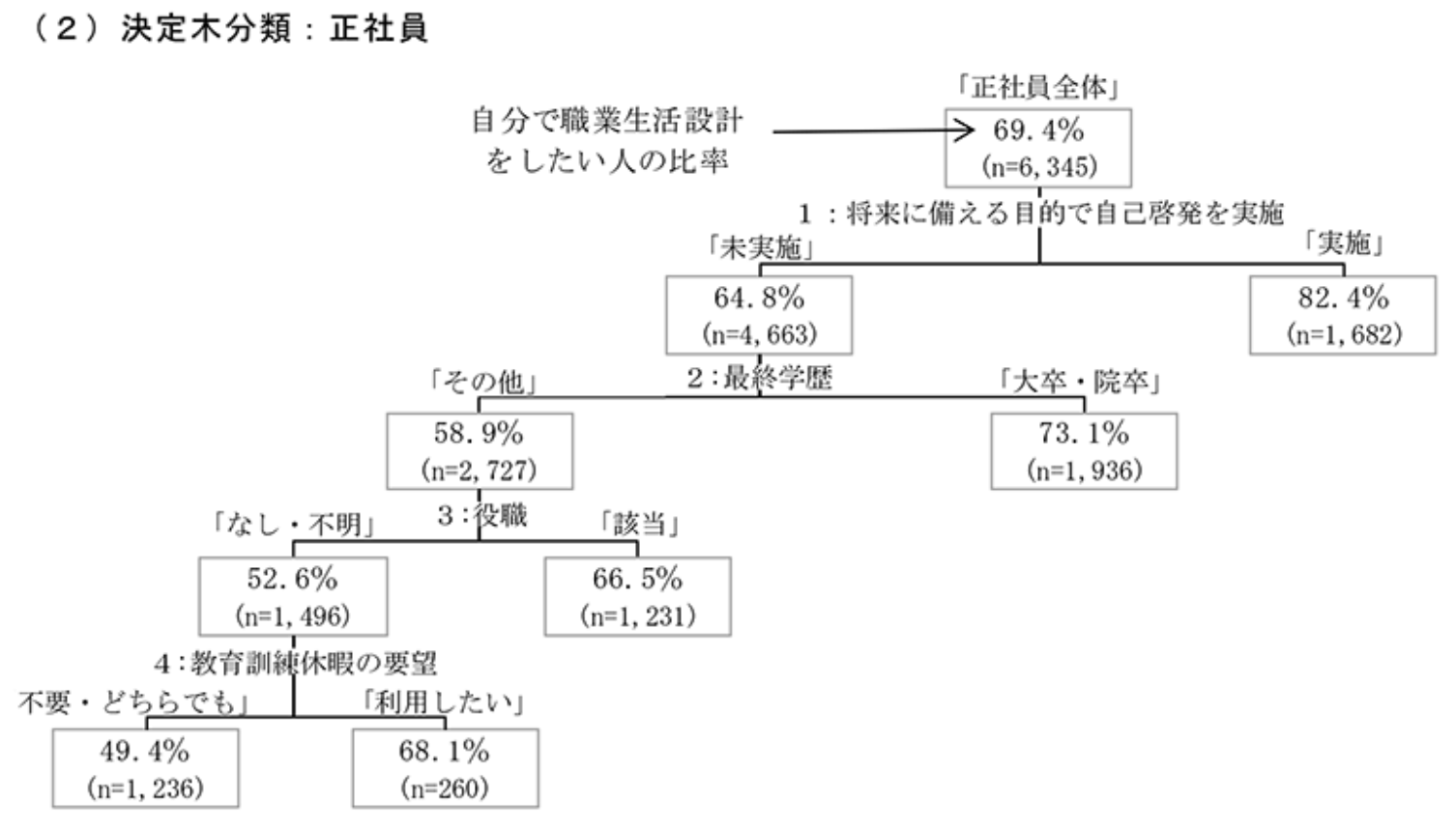 第3節にて,リスキリングに関して調べられており,「自主的にキャリア設計をしたい人を決める変数は何か?」を決定木学習によって調べている.7