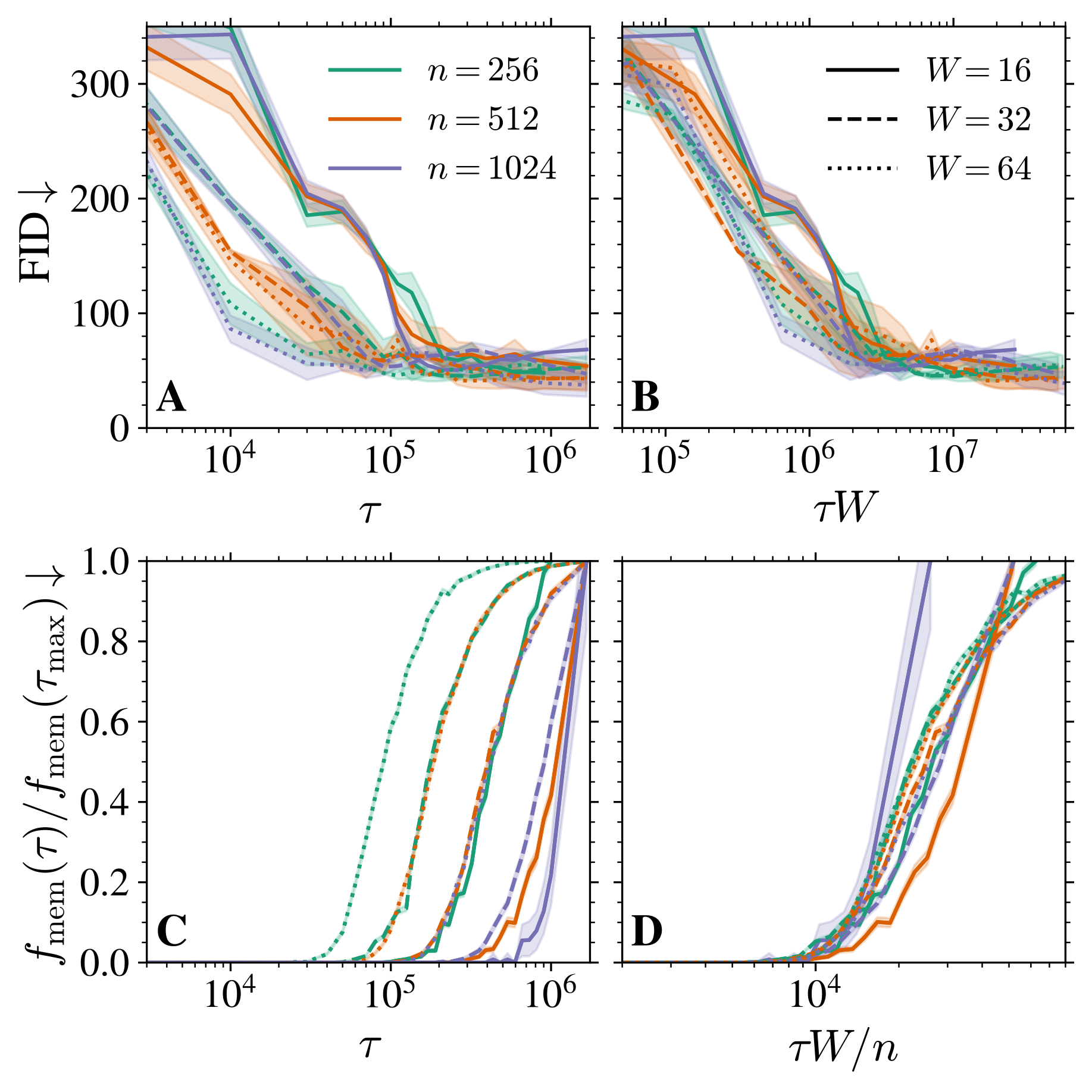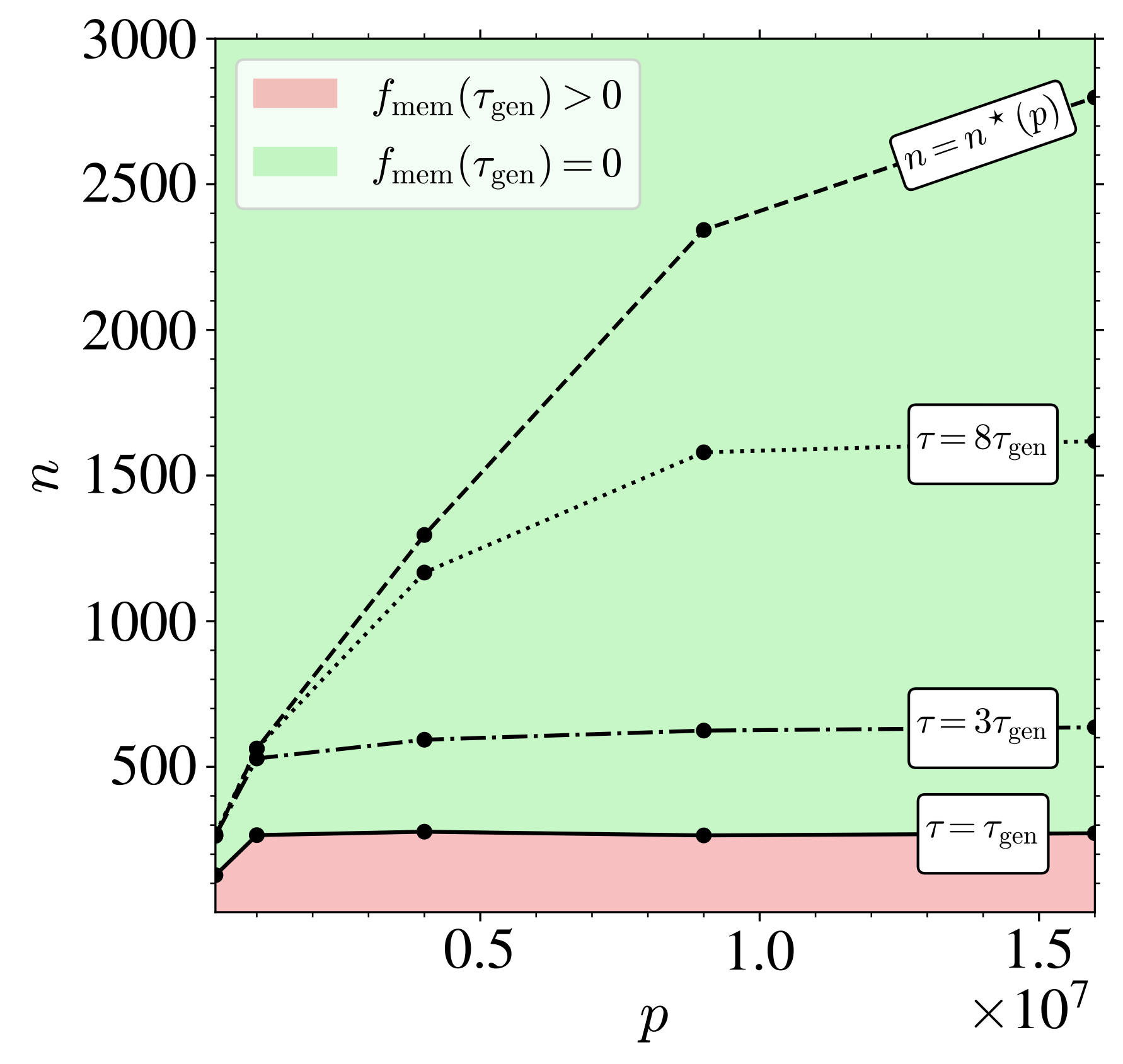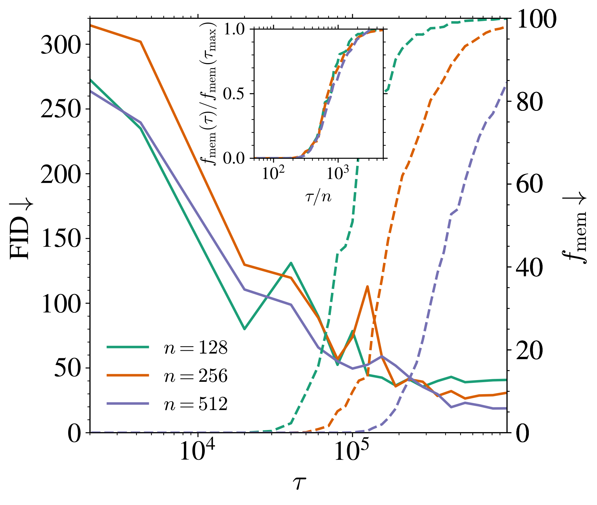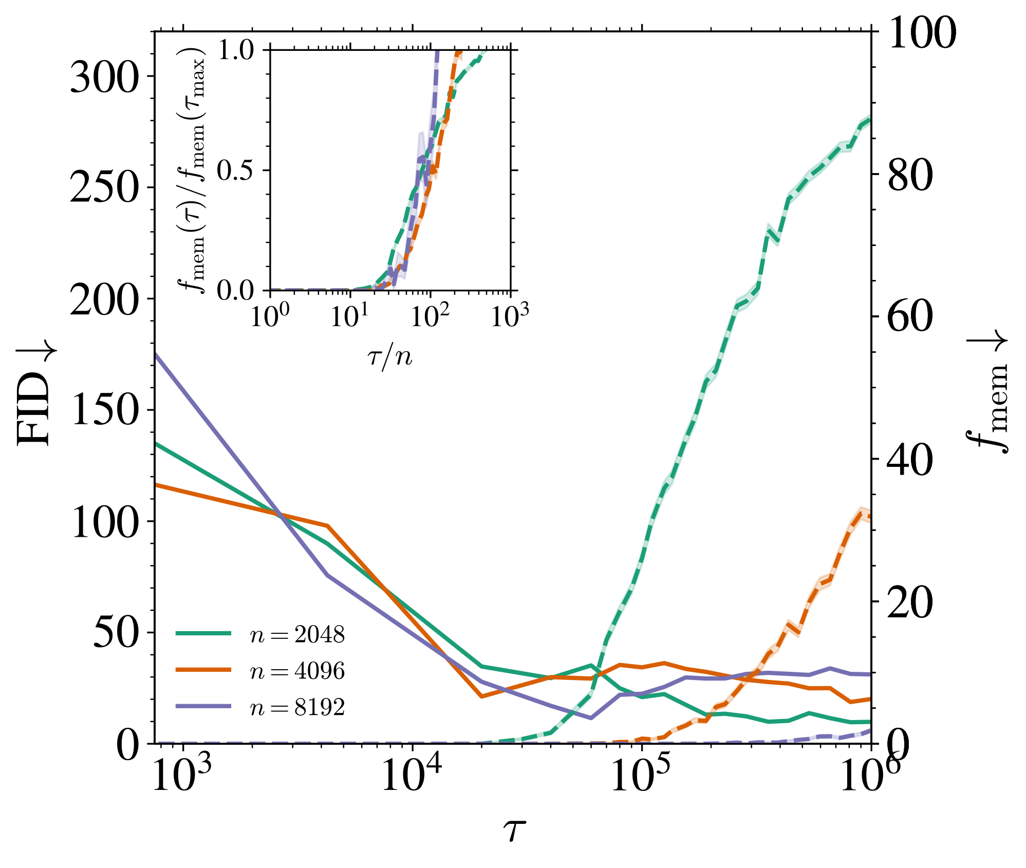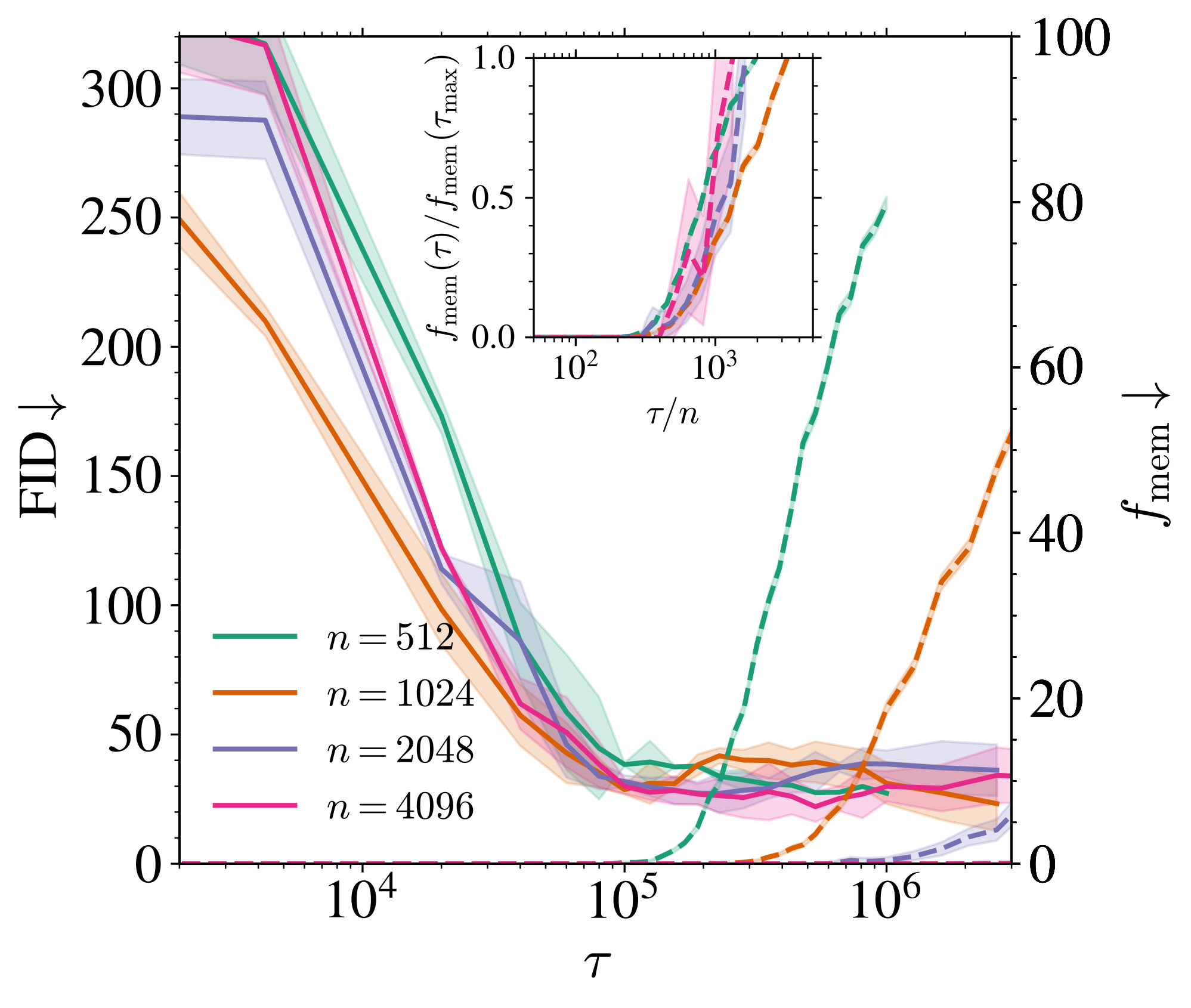 n が小さすぎると,FID が下がり始める瞬間 \tau_{\text{gen}} に memorization も起こる \tau_{\text{gen}}\approx\tau_{\text{mem}}\quad \textcolor{#EEC1C0}{p\gg n}