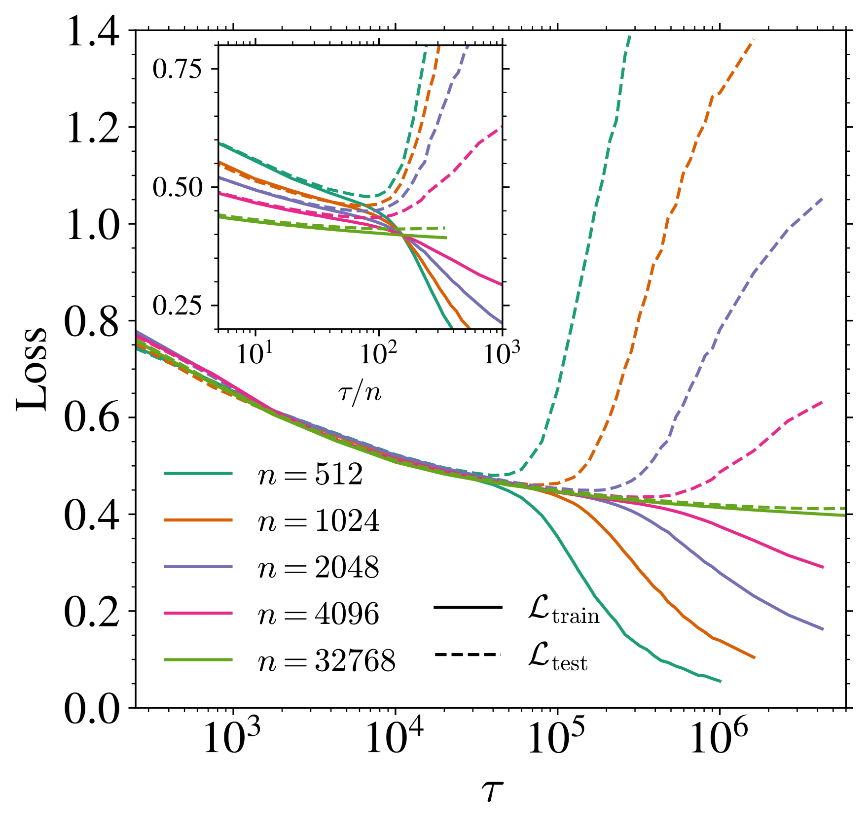 \tau_{\text{gen}} までの速いスケールでは,汎化ギャプ \mathcal{L}_{\text{gen}}=\mathcal{L}_{\text{test}}-\mathcal{L}_{\text{train}} が消える.