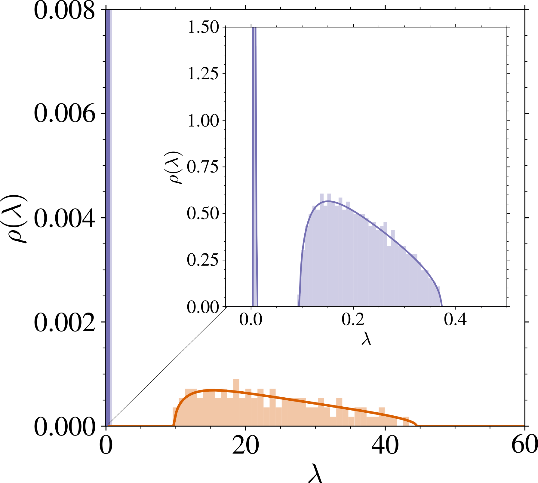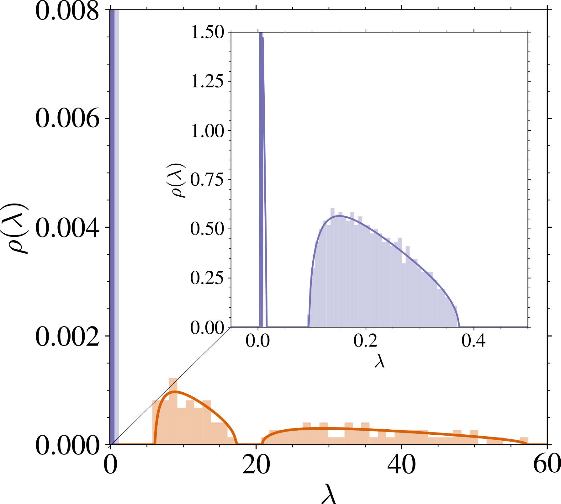 \rho(\lambda)=\left(1-\frac{1+\psi_n}{\psi_p}\right)\delta_{\{s_t^2\}}(\lambda)+\frac{\psi_n}{\psi_p}\rho_1(\lambda)+\frac{1}{\psi_p}\mu_{\widetilde{U}}(\lambda). \sup\mathrm{supp}\;(\textcolor{#928EC3}{\rho_1})=O(\psi_p/\psi_n),\qquad\inf\mathrm{supp}\;(\textcolor{#E69252}{\mu_{\widetilde{U}}})=O(\psi_p/\psi_n\cdot\psi_n).