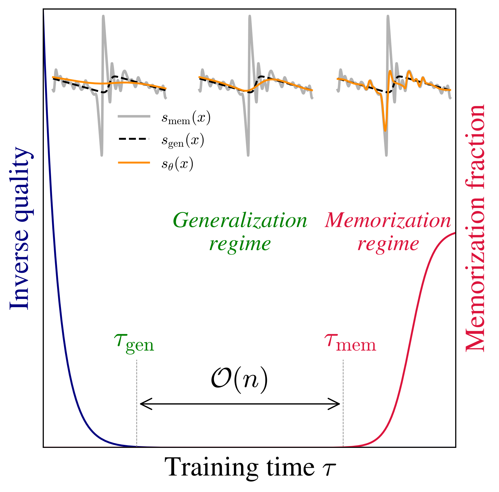 汎化が始まる時間は \tau_{\text{gen}}=O(1) だが,過学習が始まる時間は \tau_{\text{mem}}=O(n)