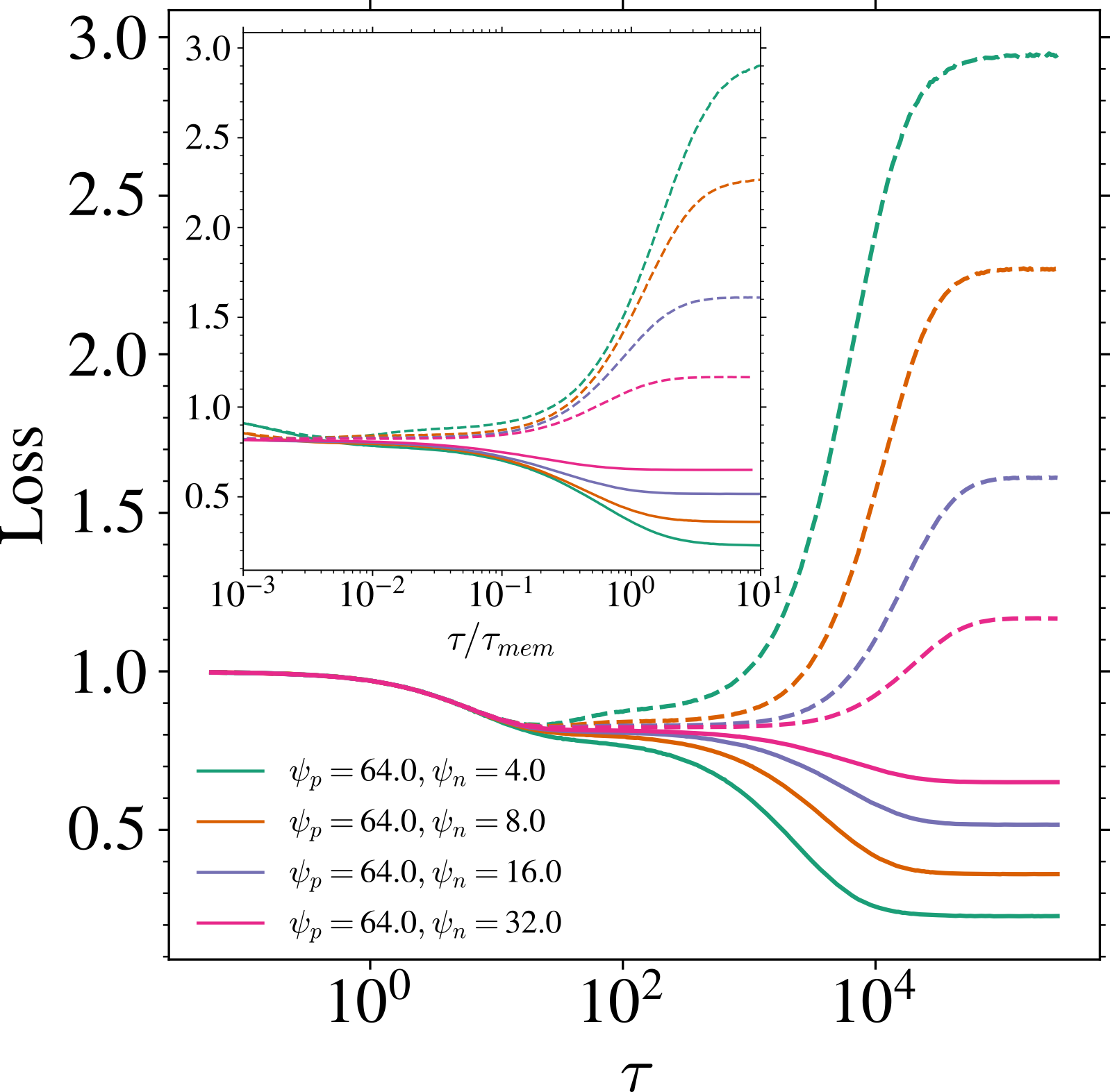 ただし,パラメータ不足領域 \psi_p<\psi_n に侵入した場合は,時間スケールの分離は見られず,architectural regularization により \mathcal{L}_{\text{gen}}=\mathcal{L}_{\text{test}}-\mathcal{L}_{\text{train}} はさらに下がる.