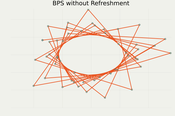 anim_traj (output_BPS, 100 ; plot_start= 50 , filename= "BPS.gif" , color= "#E95420" , scatter_color= "#78C2AD" , background= "#F0F1EB" , title= "BPS without Refreshment" , xlabel= "" , ylabel= "" , axis= false )