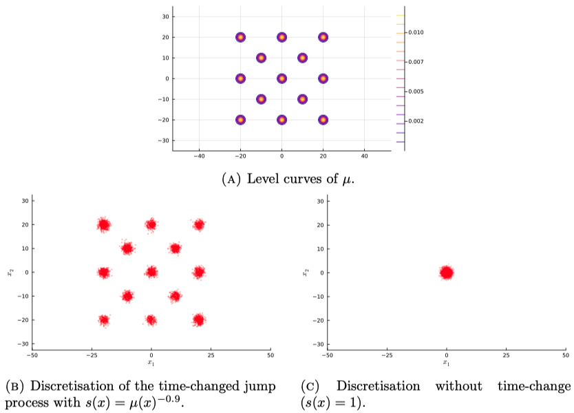 (Bertazzi and Vasdekis, 2025 ) では,なんと 13 成分の混合 Gauss 分布から,ひとつもモードを潰さない正確なサンプリングを達成していることを報告している: