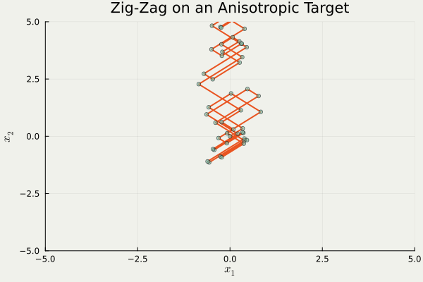 これは trajectory の形状から Zig-Zag sampler と呼ばれるが,異方性に弱いという欠点がある.